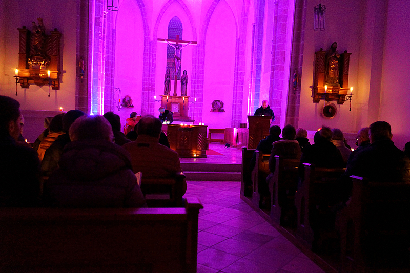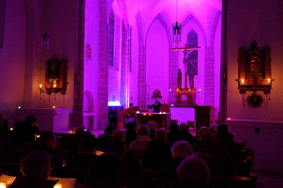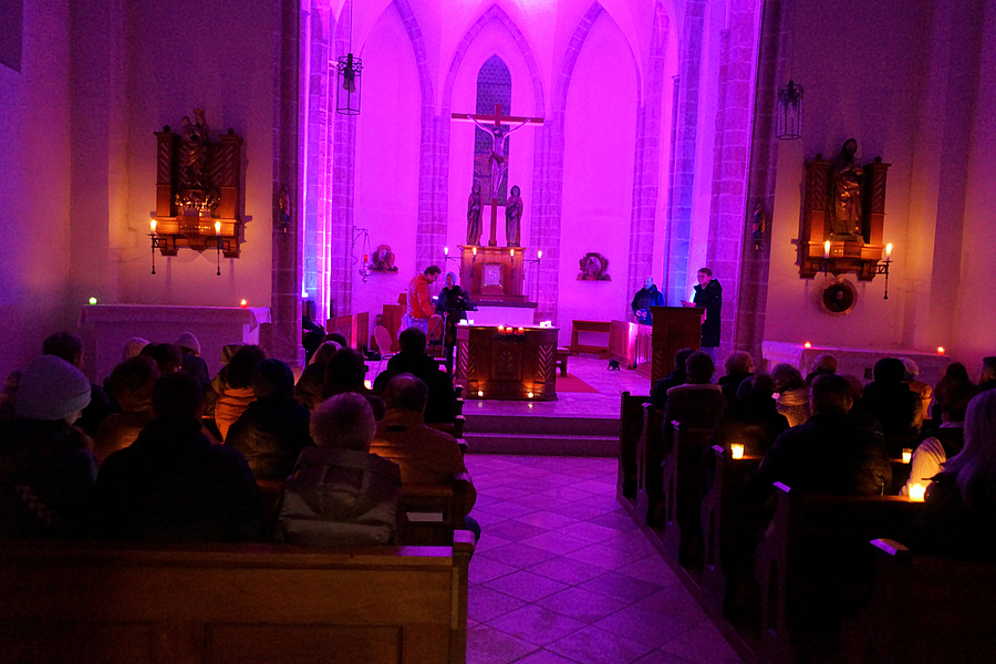 Am Freitag, den 19.12., lud die KjG (Katholische junge Gemeinde) bereits zum dritten Mal zum Adventsingen in die Schachinger Kirche ein. Für diesen Anlass wurde die gotische Kirche feierlich geschmückt, in lilafarbenes Scheinwerferlicht getaucht und von zahlreichen Kerzen erhellt. So entstand eine ruhige und besinnliche Atmosphäre, die ganz im Zeichen der Vorbereitung auf das Weihnachtsfest stand. Gemeinsam mit allen Anwesenden wurde gesungen und sich bewusst Zeit genommen, um sich gemeinschaftlich auf das kommende Weihnachtsfest einzustimmen.