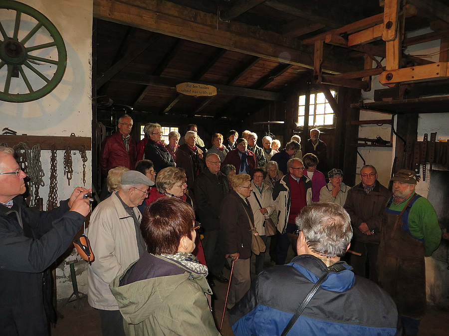 Einen Sprung in die Handwerksgeschichte vor etwa 150 Jahren machten die Senioren in der extra für sie angeheizten Hammerschmiede Voithenberghammer unweit von Furth im Wald. 1823 gegründet und 1926 wegen der zunehmenden Industrialisierung wieder aufgelassen, war die Schmiede für die Gegend der lebensnotwendige Lieferant für alle Handwerkszeuge und bäuerliche Geräte. Die Voithenberghütte wäre im Laufe der Jahrzehnte sicher verfallen, hätte sich nicht 1977 der Trachtenverein Pastritztaler darum angenommen. Mit Hilfe der Stadt Furth ist mittlerweile das Gebäude renoviert und die Schmiede voll funktionsfähig gehalten worden. Die mühsame Arbeit zur Herstellung von Schaufeln und ähnlichem Werkzeug führte Schmied Josef Meier allen vor Augen, wie schweißtreibend und anstrengend das Leben der früheren Zeit war.