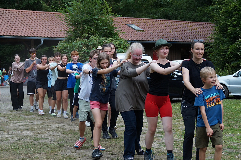 Nach dem Spiel und dem letzten Mittagessen, galt es dann den Platz zu säubern, die Zelte abzubauen und alles in bester Ordnung zu hinterlassen. Als das passiert war, wurde noch getanzt. Eine Polonaise konnte noch abgehalten werden, bis der Regen einsetzte. Versammelt unter dem Vordach der beiden kleinen Gebäude machte sich dann auf einmal Abschiedsstimmung breit. Nach vier Tagen geht jeder zwar mit Freude auf das eigene Bett nach Haus und trauert doch dem hinterher, was nun vorbei ist. Für einige war auch klar, dass es wohl das letzte Zeltlager sein wird, das machte die Situation nicht leichter. Jedes Jahr, gleich wie anstrengend alles ist, sammelt doch jeder einzelnen Erfahrung, die prägend sind. Aus diesem Grund gilt es noch einmal ganz deutlich ‚Danke‘ zu sagen: