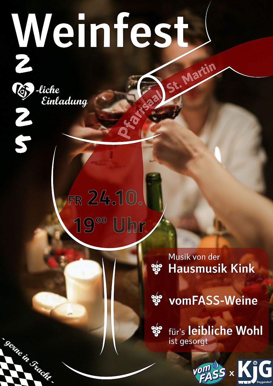 Die KjG lädt am 24. Oktober herzlich zum Weinfest in den Pfarrsaal St. Martin ein. Ab 19:00 Uhr werden erlesene Weiß- und Rotweine ausgeschenkt und für das übrige leibliche Wohl ist ebenfalls bestens gesorgt. Umrahmt werden die Weine vomFass mit Klängen der Hausmusik Kink, so dass einem wunderbaren Abend nichts mehr im Weg steht.